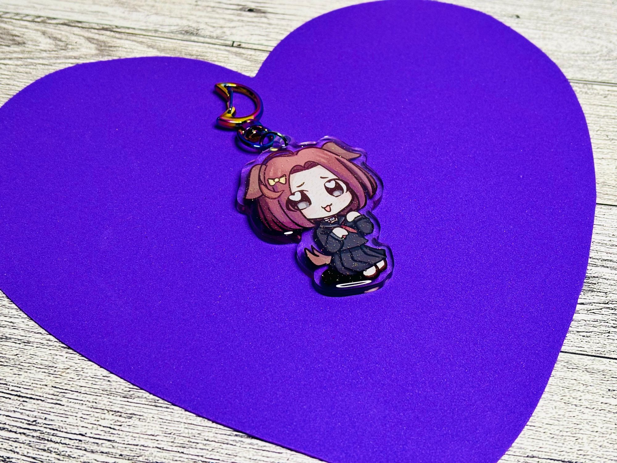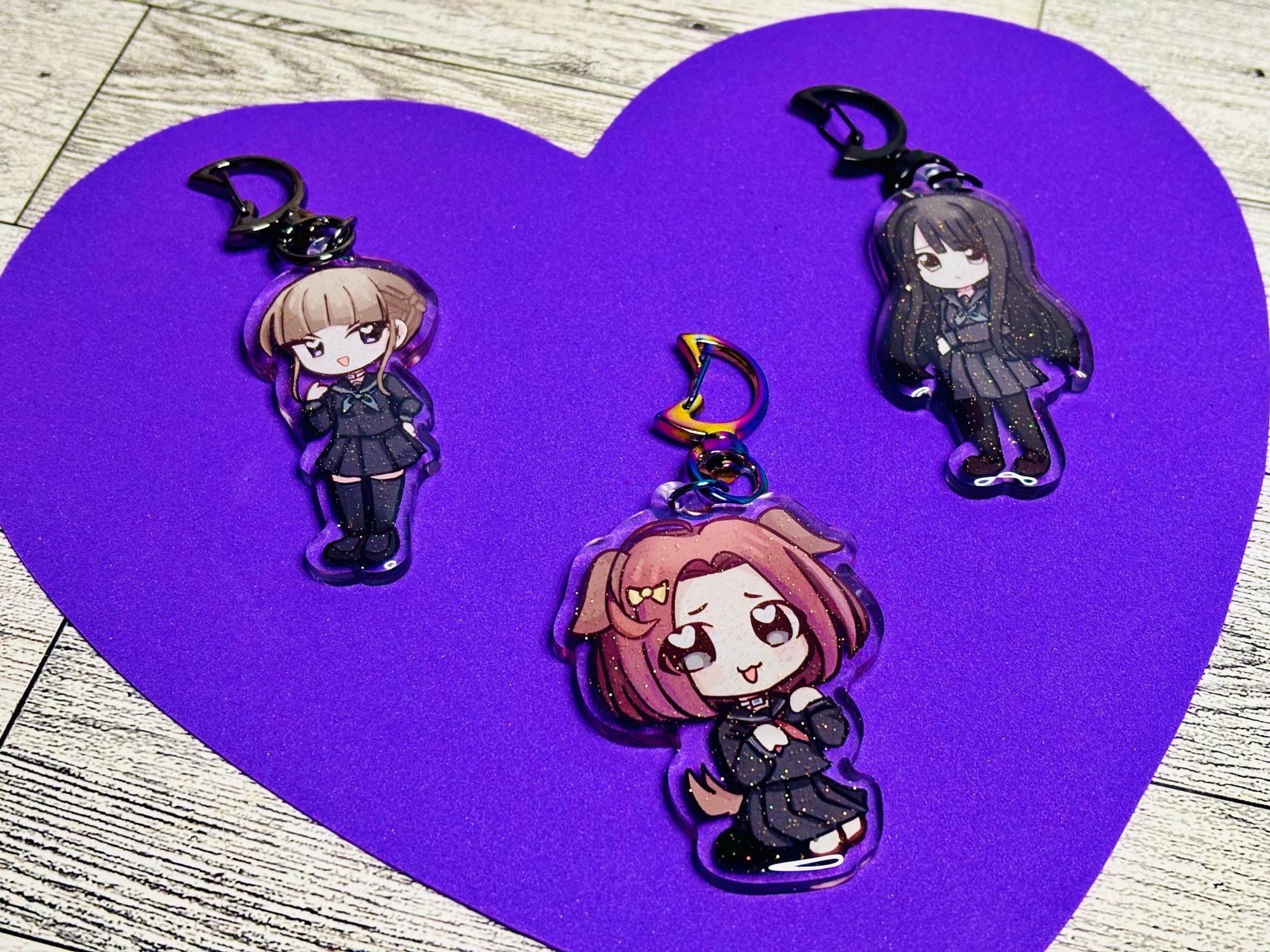Clear, glitter acrylic keychain of the girls from the psychological horror visual novel, Euphoria.